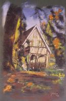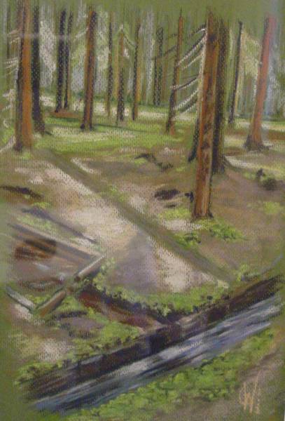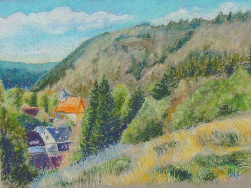 Wenn wir am Dammgraben weiterwandern, können wir noch einmal etwas später abbiegen. Zunächst kündigt heftiges Wasserrauschen den Grabenknick am Silberbrunnen an. Ein langes Holzgerinne überwindet einen weiteren Höhenunterschied des Grabens. Mittig wurde ein Zulauf gefasst: der Silberbrunnen. Noch einige Schritte, dann lenkt ein Forstweg nach links die Schritte zum Mühlenberg. Vor uns in der Ferne der Ortsteil Bornkappe, hinter uns der Felskegel der Wolfswarte auf dem Kamm des Bruchbergs. Weiter geradeaus und abwärts nach 1/2 Stunde öffnet sich erneut der Blick auf die Altenauer Kirche. |