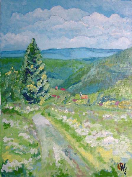 An der Kreuzung Dammgraben/Oker wenden wir uns nach links ein Stückchen bergauf. Das Grabenwasser fließt immer rechts neben uns. Der Grabenweg führt uns bis zur Kreuzung Dammgraben/Baumannweg, hier noch ein breiter Fortstweg. Wir können links abbiegen. Am Waldende öffnet sich der Blick auf die Kunstbergwiesen. Bald grüßt im Talgrund der Turm der Altenauer Kirche. Abwärts über die Wiesen erreichen wir schnell die Otsmitte. |
